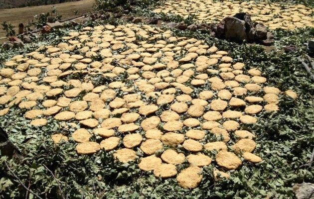 A napon száradó lepényalakúra lapított tarhana, amit a száradás után apróra zúznak