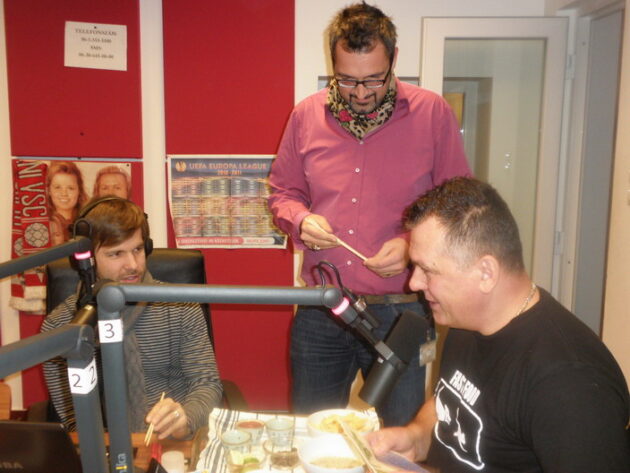 Sebestyén Balázzsal és Rákóczi Ferivel a hajdanvolt Class FM Morning Show stúdiójában, amint éppen rovarokat készítettem a csapatnak.