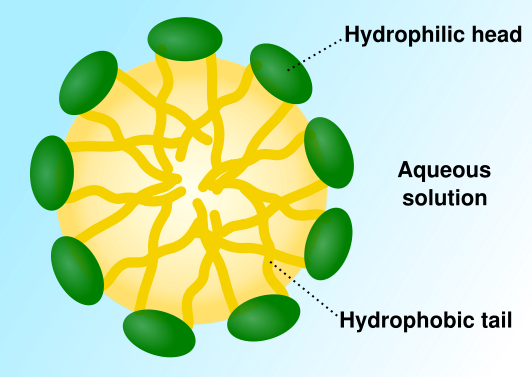 A molekula zölddel jelölt vizet szerető (hidrofil) és sárgával rajzolt vizet nem szerető (hidrofób) farok része a vizes közegben úgy rendeződik el, hogy végül a legoptimálisabb alakzat a gömb (micella) alakul ki.