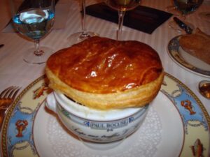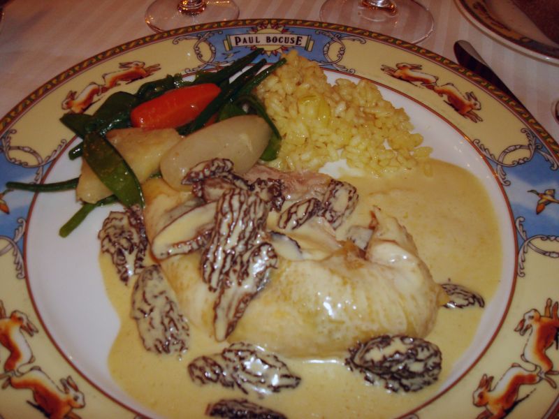 Bocuse nevét leginkább az 1970-es évek Nouvelle Cuisine-jával kapcsolják össze, ám nem szabad elfeledkeznünk az Evening Standardban 1985-ben megjelent kritikus nyilatkozatáról sem, miszerint „az úgynevezett nouvelle cuisine rendszerint keveset jelent a tányéron és sokat a számlán.” Konyhaművészetében a 20. század végi nouvelle cuisine bizony alig-alig lelhető fel. A következő képen a fekete lábáról is felismerhető bresse-i csirke hagyományos és nevezetes szarvasgombás változata látható Az étel a lyoni Mére Filloux és Mére Brazier hagyományos konyhájának hű tükre.