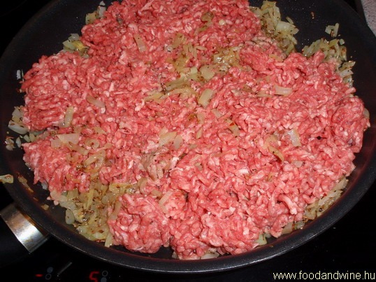 Közben a hagymát finomra vágjuk és serpenyőben olívaolajon dinszteljük. Egész köményt és római köményt adunk hozzá, valamint a durvára tört borskeveréket (szecsuáni bors lehetőleg legyen benne). Ha a hagyma üveges, hozzáadjuk a darálthúst, némi vizet és a fokhagymát, majd főzzük és zsírjára pirítjuk. Amikor a hús már majdnem elkészült, pirospaprikát és sót adunk hozzá. (A darált húsnak legyen színe, ezért ennek megfelelő mennyiségű paprikát adjunk hozzá.)