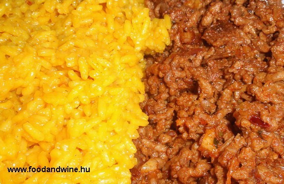 Az íly’módon majdnem teljesen megpuhult rizst keverjük össze a fűszerezett, főtt, darált marhahússal. Az ízek lágyítására adjunk hozzá 2 evőkanál tejfölt is, és jól keverjük össze. Szükség és ízlés szerint ekkor még fűszerezhetjük őrölt köménymaggal, sóval, borssal.