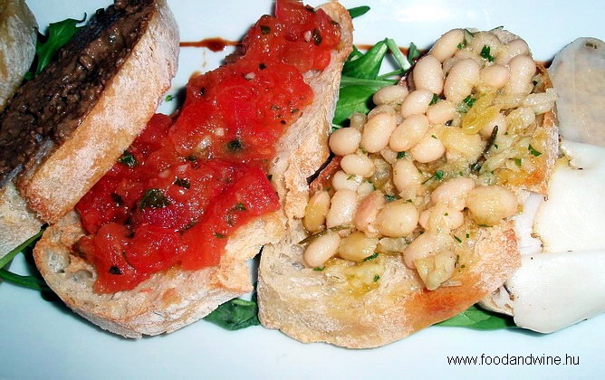 Nincs miről különösebben beszélni, a bruschetta ismerős és kedvelt és – mint említettem – pásztor, paraszti étel, amit délen, Apulia vidékén napérlelte, napmeleg paradicsom felvágásaval és kenyérre halmozásával képzelnek el, amihez legfeljebb só és olíva olaj társul. Toszkánában a bruschetta neve „fettunta”, azaz olajozott szelet. A bruschetta minden összetevője fontos, de a kenyérnek frissnek illik lennie. Minél frissebb, annál szebb, finomabb a bruschetta. A képen májpástétomos, paradicsomos, babos és szalonnás látható.