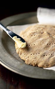 Recept: 200ml víz, 400ml árpaliszt, 1/2 tk. só keverékét gyúrjuk, állni hagyjuk, négy darabra szaggatjuk, kerek formára lapítjuk, majd 15 percig 260°C hőmérsékletű, előmelegített sütőben sütjük.