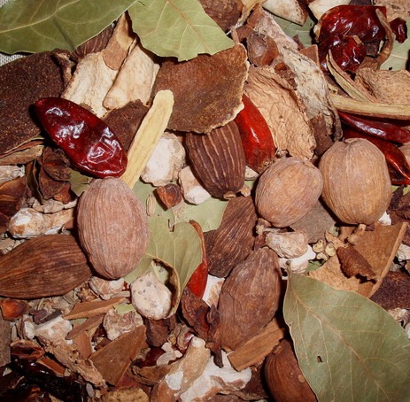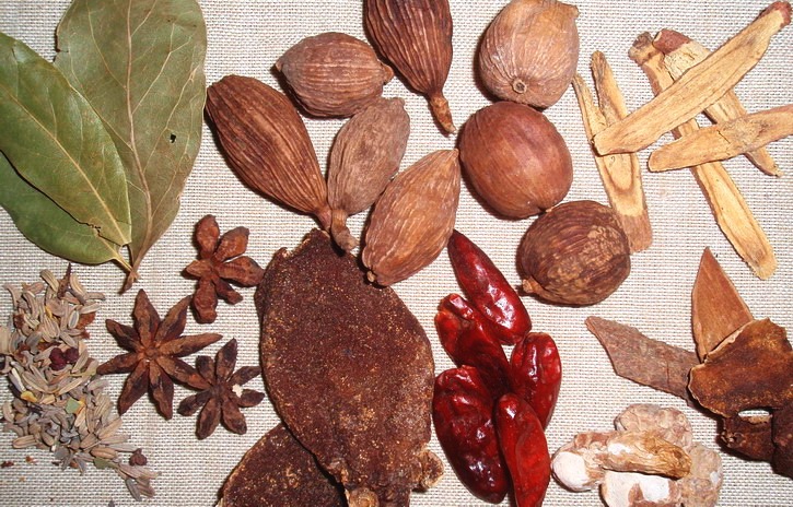 - alsó sor: ánizs, szecsuani bors, csillagánizs, szárított narancshéj, chili, szárított gyömbér, galanga, kasszia, szárított lime héj.