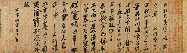 Az előző fotó egy 34 x 119,5 centiméteres tekercsről készült. A tekercsen Su Dongpo (eredeti nevén: Su Shi), a Song Dinasztia legbefolyásosabb költőjének verse olvasható. A vers egy Hangzhou városában megrendezett Hideg-étel Fesztiválról szól.