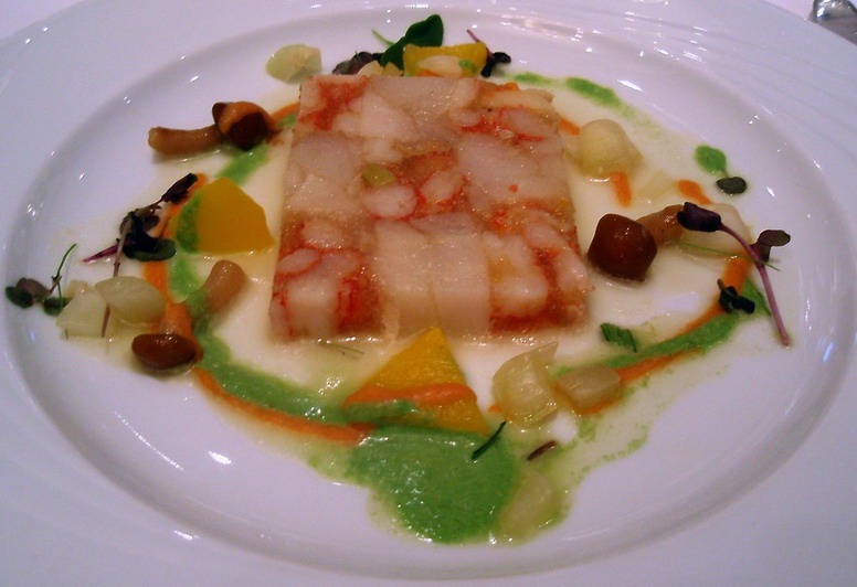 Balatoni fogas és folyami rák terrine, halkivonat mártással és benne gőzölt zöldségekkel (Somlai Tamás, Apetito Restaurant & Café)
