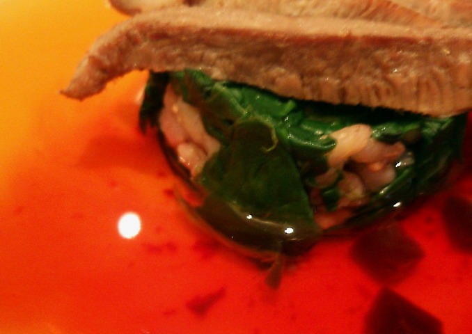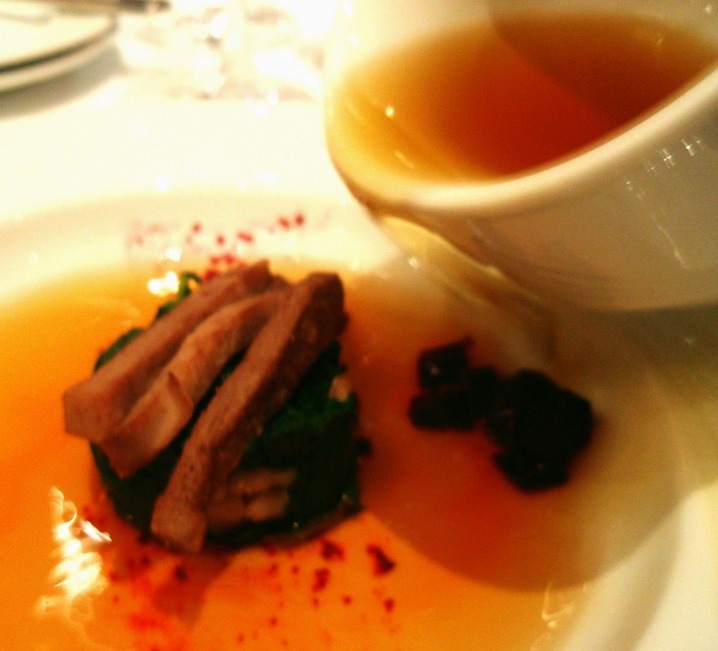 Marhanyelv erőleves zöldbe göngyölt málnás gerslivel és roséban főtt céklával (Vályi László, Thermál Hotel, Visegrád)