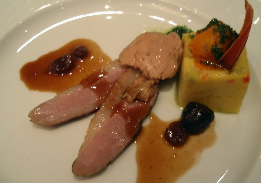 Májával sült, rózsaszín kacsamell, áfonyás bormártással és csilis sütőtök pürével (Pap Lajos, La Fiesta Party Service)