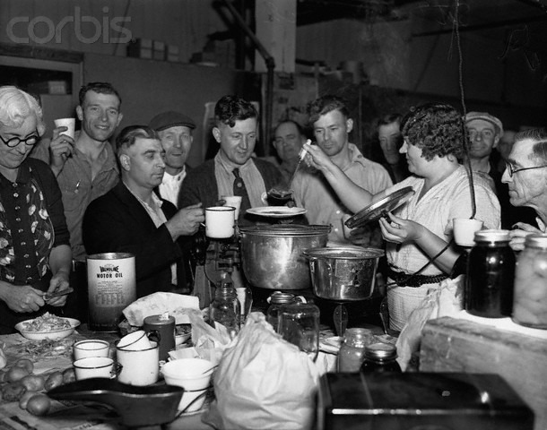 Ha az ember a 30-as évek idején íródott szakácskönyvekben, vagy a női magazinok rovataiban keresgél a „túlélés konyhája” nyomai után, akkor nem sokat talál. Gyakorlatilag semmit. A válság nem létezett, legalábbis ezeken a helyeken nyoma sincs. A kiadók csupán a fizetőképes piaccal foglalkoztak és a munkanélküliek nem számítottak annak, márpedig a „túlélés konyhája” az ő nevükhöz tapad. Az ő táplálásukra jöttek létre a képen is látható „leves konyhák”