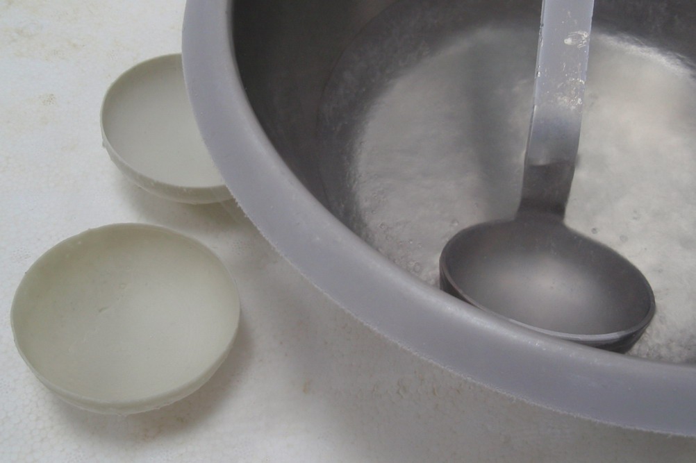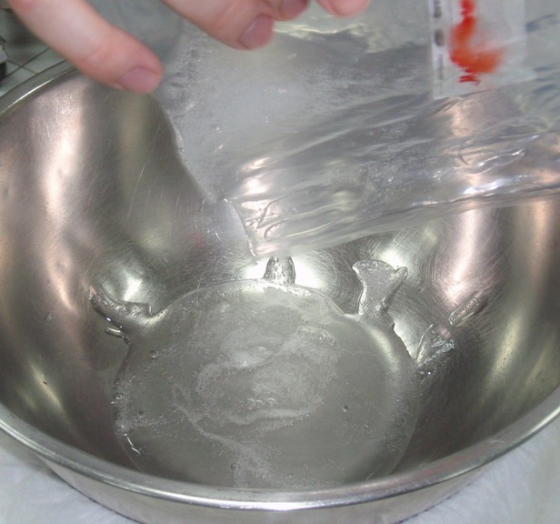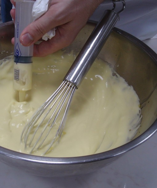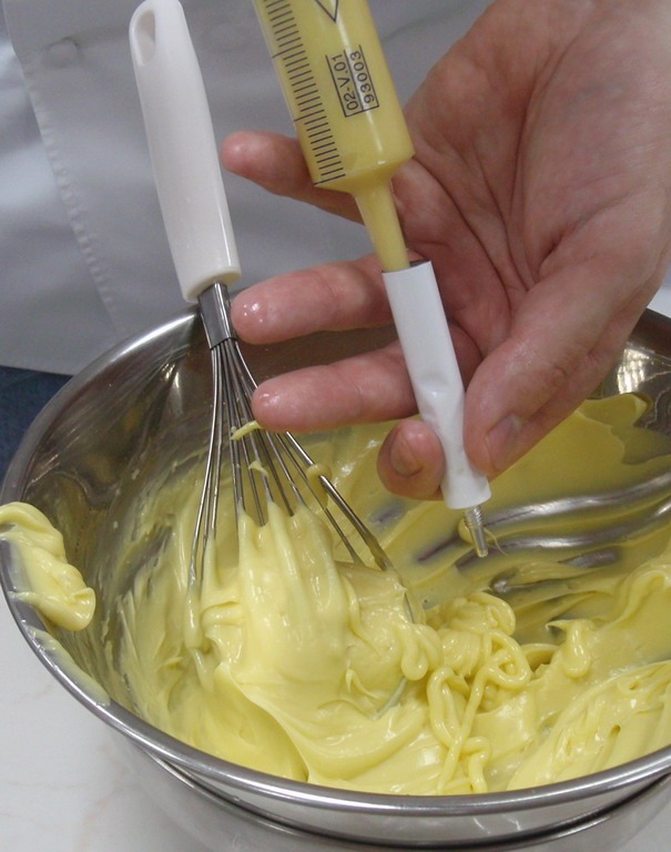 - Megjegyzés: ügyeljünk arra, hogy a fecskendőben ne maradjon levegő, mert így kinyomva megszakadhat a folyamatos „tészta” szál. Arra is ügyeljünk, hogy a forró vízben lehetőleg ne sok buborék vegye körül a „tésztát”, mert ez esetleg rombolhatja a textúrát.
