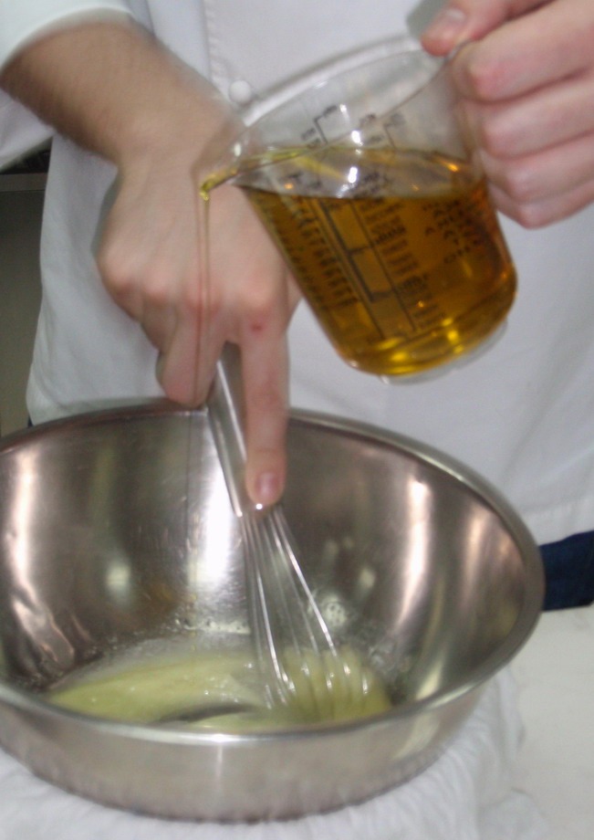A kakaóvajat felolvasztjuk (60°C), majd állandó keverés mellett hozzáadjuk az olíva olajat. A keverőtálat jégfürdőre állítjuk és a kakaóvaj, olíva olaj keverékét addig keverjük, amíg meg nem szilárdul és vajszerű állaga nem lesz. Ha elkészült a „vaj”, akkor a gyógyszertárban is kapható, tehát az élelmiszeripari minőségnek is mindenben megfelelő tubusokba tölthetjük, majd hűtőszekrényben (+5°C) tárolhatjuk.
