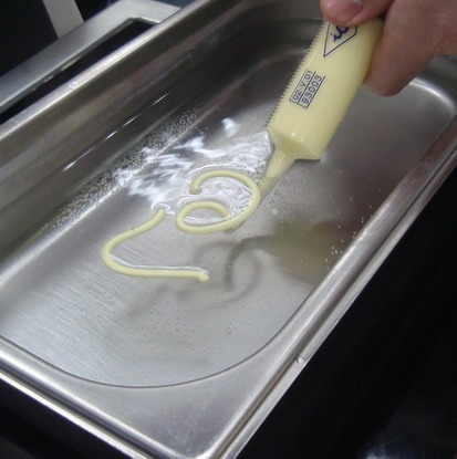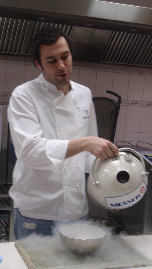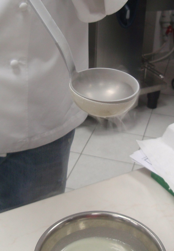 A tálba öntött folyékony nitrogénbe helyezzük a merőkanalat, ami így ugyancsak -196°C-ra hűl. A mellette lévő edényben van a gorgonzolás tej, ami a merőkanál külső palástjára fagy, amikor azt belemártjuk. Így jön létre a „kupola”.