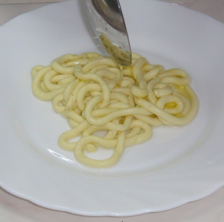 - Hosszabb ideig azért sem érdemes a „tésztát” a vízben tartani, mert a „tésztából” íz molekulák mennek át a hígabb oldatba, a vízbe (ozmózis). Ugyanez a jelenség előnyünkre is hasznosítható: amennyiben egy töményebb ízesített folyadékba helyezzük a „tésztát”, akkor van esély arra, hogy a „tészta” a kívánt molekulákkal dúsuljon. (Én a magam részéről ettől ebben az esetben nagy csodát nem várok, de meg lehet próbálni.)