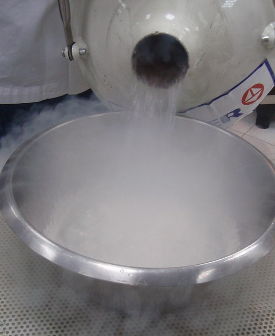 - Megjegyzés: A fenti képen Adam Melonas a -196°C-os folyékony nitrogénbe dugja az ujját. Varázsló? Dehogy! A jelenség némiképpen hasonlít a tűzön járáshoz. A folyékony nitrogén esetében a testhőmérséklet hatására az ujjunk felszíne mellett egy vékony, de szigetelő nitrogén-gáz réteg alakul ki. Ez gátolja meg, hogy az ujjunk megfagyjon. Persze nem tanácsos ujjunkat huzamosabb ideig a folyékony nitrogénben tartani, és a kezünknek is száraznak kell lennie(!), de az a fajta beöltözés, amit például Heston Blumenthal az összes folyékony nitrogénes fotóján bemutat, bizony, sokkal inkább szól a közönségnek, és a show-nak, mint a folyékony nitrogénnek.