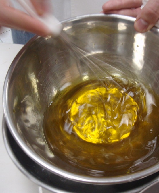 A metil-cellulózból és desztillált vízből ~3 súlyszázalékos metil-cellulóz oldatot készítünk. (A képen Ferran Adria termékcsaládjából látható a „Metil”.) Hozzákeverjük az olíva olajat. A keverésnél úgy járunk el, mint a majonéz készítésénél. Ha felvette az olajat, fecskendőbe szívjuk és óvatosan forró vízbe fecskendezzük. (Melonas az alapanyagokat előre kimérve hozta a bemutatóra. Ez a magyarázata a zacskók használatának.) A forró vízben a „tészta” megtartja alakját és kellően szilárd marad, lehűlve szétesik.