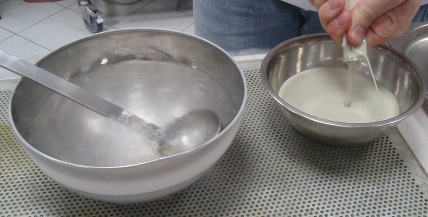A sajt és tej keverékét alaposan simára keverjük, 15 percig állni hagyjuk, majd szűrjük. Egyszerű, semmi komplikált nincs benne, csupán az a lényeg, hogy minél egyneműbb legyen a keverék.