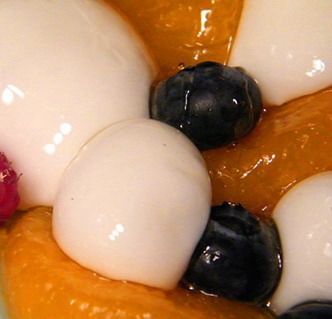 A joghurt raviolit általában gyümölccsel szervírozzák. Az első fotón a joghurt ravioli (reverz szferifikáció), mangó kaviárral (szferifikáció) és passiógyümölccsel lett tálalva. A bal oldali képen a ravioli ugyancsak gyümölcsökkel szerepel. Egyszerűen elkészíthető „reverz szferifikációs” fogás. A következő részekben a joghurt raviolinál jóval összetettebb receptek is előfordulnak majd, azonban valamennyi lényege mindig egy és ugyanaz, csupán a kivitelezés lépéseinek száma változik.