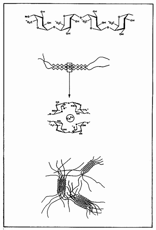 láncot a kalcium ionok stabilan összekapcsolnak. A harmadik sorban szereplő ábra az előzőnek egy kinagyított részlete, és azt mutatja meg, hogy a kétértékű kálcium-ion hogyan kapcsolja össze a láncokat. A negyedik sor ábrája azt mutatja, hogy mi történik akkor, ha a Ca-ion koncentrációt emeljük. Ebben az esetben vastagabb gél-réteg alakul ki.