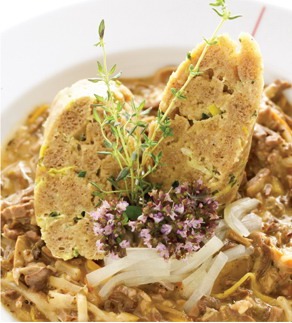 - Zsemlegombóccal, grízgombóccal, burgonyapürével, kenyérrel tálalhatjuk.