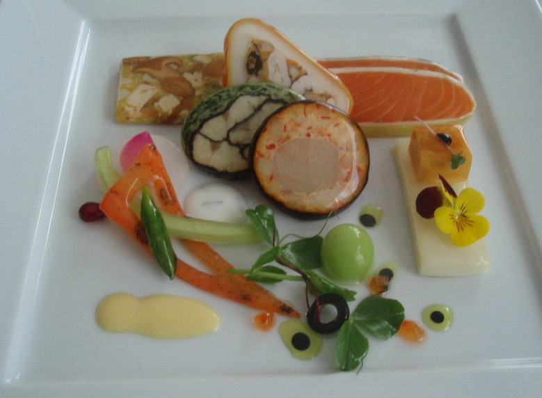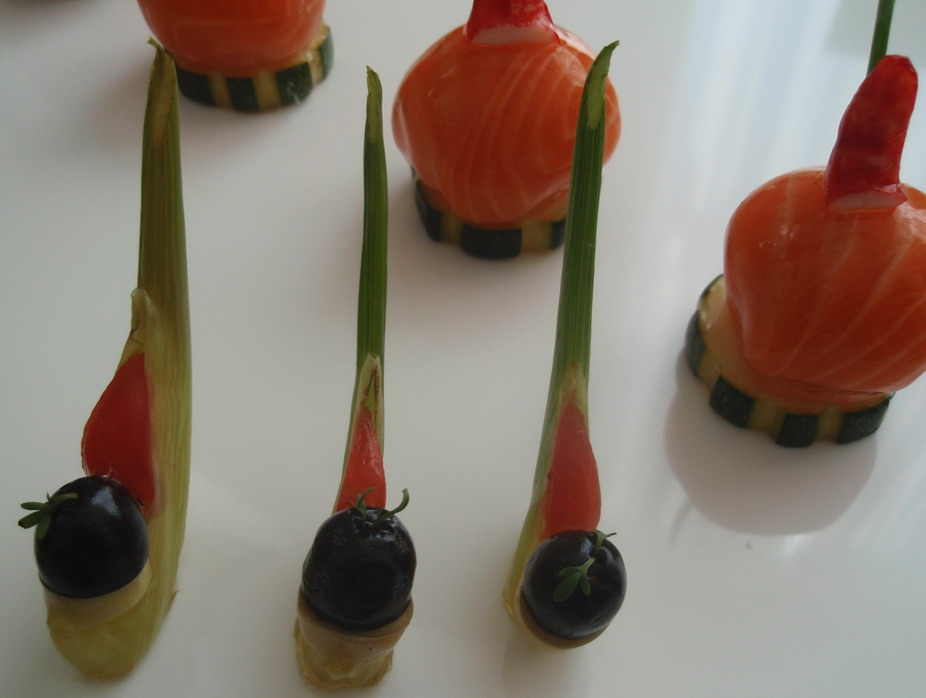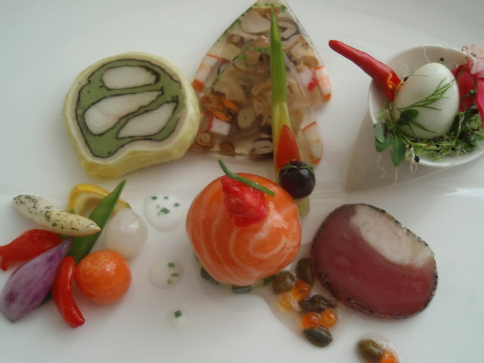 MIELŐTT MEGÍRNÁM BESZÁMOLÓMAT a 47. Mestervacsoráról, amely – mint mondják – számos tekintetben elüt az előző negyvenhattól, néhány képet még mutatok azokról a hidegkonyhai szín- és formacsodákról, amelyeket április 18-án a Ramada Hotelban, Balatonalmádiban láthattam. Mint az előző részben már említettem, ezeket a hidegkonyhai érdekességeket sokan meglehetősen lenézik, semmibe veszik és nem tekintik többnek, mint a múlt csökevényének. Én egészen máshonnan indulva egészen mást látok ezekben az „alkotásokban”. Szépséget, formát, színeket, kompozíciókat, hosszas töprengést és elmélyültséget. Ez inkább képzőművészet, mint szakácsmesterség. Lehet utálni, lehet szeretni, de nem tudomásul venni mégsem lehet. Vannak: és egyáltalán nem könnyű elkészíteni őket.