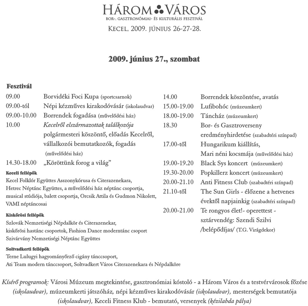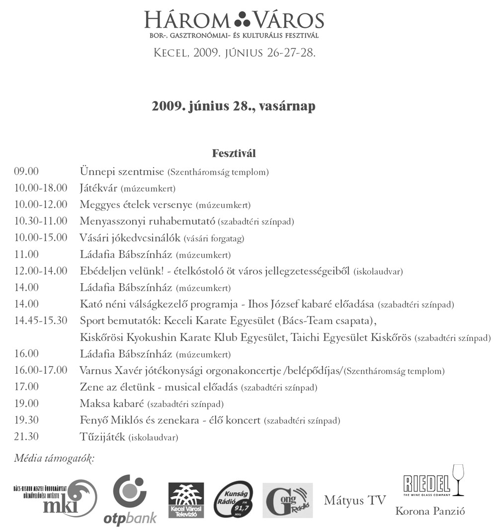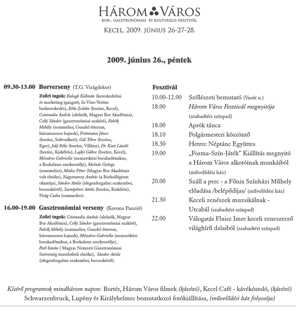 Az idén Kecel városa ad otthon a két évvel ezelőtt Soltvadkerten elkezdődött, majd Kiskőrösön folytatódó Három Város Fesztiválnak. A rendezvény elsősorban a borról és a gasztronómiáról szól és fesztivál jellegével hamar népszerűvé vált. A három napos rendezvény gazdag programja a folytatásban található (Kattints az oldalakra!)