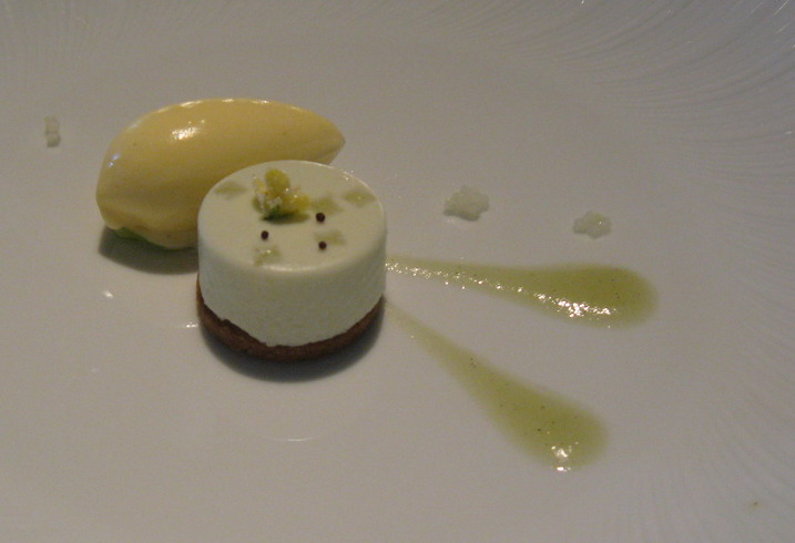 Granny Smith alma "bavarois" fahéj "sable"-val, dijoni mustár jégkrémmel és "kristályosított" Napa Valley mustárvirágokkal