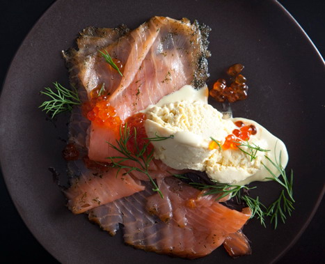A most következő recept talán egyszerűbbnek tűnik, miközben ugyancsak lazachoz társul, ahogy a képen is láthatjuk. A kapor üdítő színfolt és a nyár könnyed, friss ízeinek kitűnő képviselője. Némi lazackaviár csak javít a helyzeten. Tiszta, határozott ízek. Eltérő hűmérsékletek és hozzá társuló textúrák. Egyszerű, mégis gyönyörködtető étel.