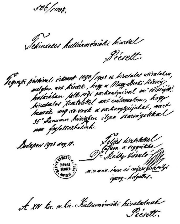 Pécsett.Tegnapi póstával érkezett 1090/1903 sz. hivatalos okiratukra,