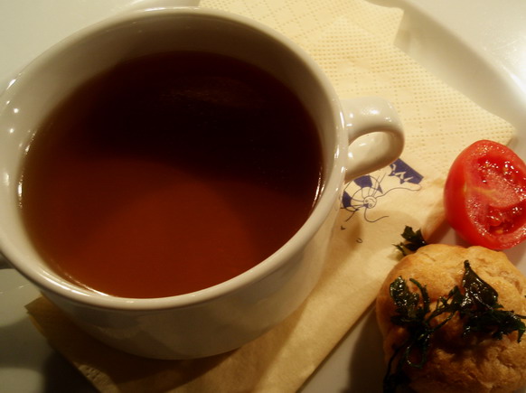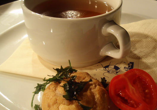 A galambleves, pláne a „galamb-eszencia” szinte már ezoterikus ételnek számít. Az elnevezéssel tehát kellő óvatossággal bánjunk, mert ennek az ételnek csodás gyógyerőt tulajdonítanak már századok óta, amiben akad is némi igazság. Mondom mindezt azért is, mert ez az egyébként nagyon is ínyemre való leves érzésem szerint nem érte el a consommé duouble, azaz dupla erőleves koncentráltságát. A mini fánkba visszatöltött galambhús pástétom jó és méltó ötlet az alapanyaghoz.