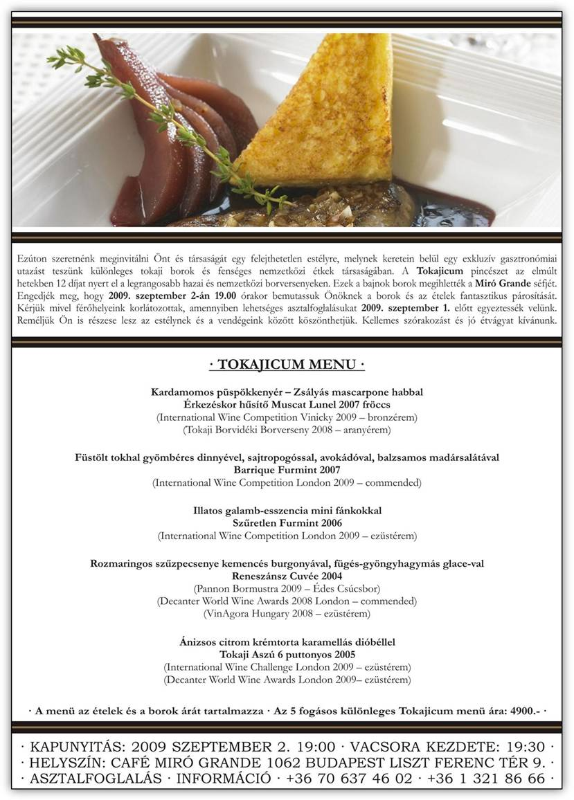 A előbbi étlapon felsorolt ötfogásos borvacsorát a Tokajicum Borház díjnyertes boraihoz a Café Miró séfjei – SIMON Gábor és ÁCS Krisztián – készítették. (A borokról a TOKAJICUM honlapján lehet tájékozódni.)