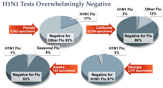 Az alábbi ábra forrása a CBS News honlapja és azt ábrázolja, hogy például Alaszkában a 722 H1N1 influenza vírus fertőzésnek tartott eset közül 93% negatív volt influenza vírusra, 5% volt a „megszokott” szezonális vírusfertőzés és csupán 1% volt a 2009 H1N1 influenza vírus fertőzés.