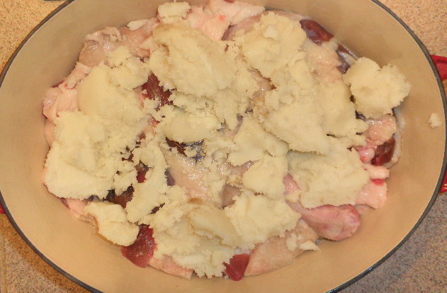 A sózási idő (24 óra) elteltével a combokról a sót bő folyóvízzel lemossuk, majd papírtörülközővel szárazra töröljük, s a félretett bőrös hájjal együtt vastag falú, a hőt jól tartó és elosztó öntöttvas edénybe helyezzük. (Ha nincs, az se baj, de az említett edény lenne az ideális.) Az edénybe még annyi libazsírt, vagy libahájat tegyünk, hogy a megolvadó zsír a combokat majd teljesen ellepje. (A zsírban abálást persze lehetne másfajta zsírral – kacsazsír, disznózsír – is végezni, vagy akár olajjal is, a lényegen nem változtatna, de az ízek némiképpen eltérőek lennének.)