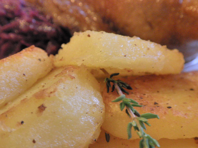 A friss, meleg libazsírból adtam a serpenyőbe is, és a korábban félig megfőzött sütnivaló burgonyát kakukkfűvel együtt ebben pirítottam szép aranyló barnára, ropogós kérgűre. Az abált libacombokhoz ez a burgonya, s ugyancsak libazsírral készült párolt lilakáposzta került.