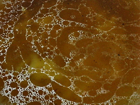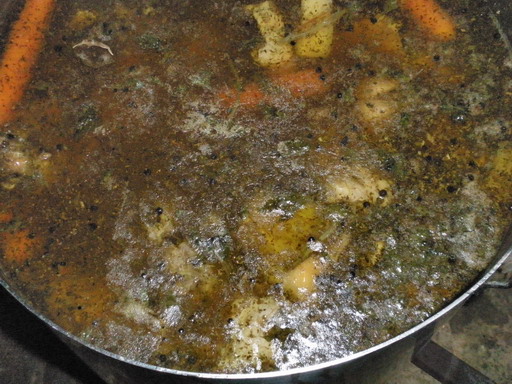 Amíg eszegettünk, borozgattunk, a présház előtti kondérban csendesen hűlt a libaleves, tele a libának levesbe illő alkatrészeivel. (Nem kerestem fakanalat a közelben, pedig ha a levest megkeverem, szebben mutatna a fotón.)