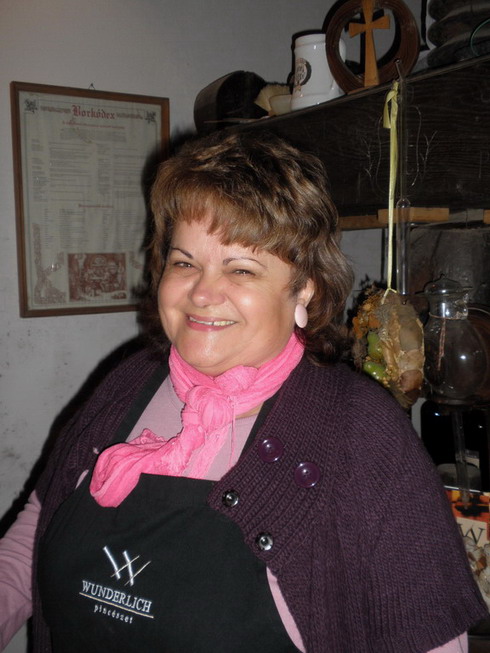 A végére hagytam Edit fotóját. Ő az Asszony, aki a címben szerepel, s akinek eddig fel nem ismert jelentős szerepe van a Lojzi-vacsorák sikerében. Megérdemli hát, hogy erről tudomást szerezzünk, hiszen sokan vagyunk már, akik a hegyen ettünk és Wunderlich Lojzi jó hírét vittük. Kijelenthető, hogy a Wunderlich famíliában a nevezetes kakaspörkölt mellett nevezetes libaleves is akad, amit érdemes megkóstolni – jóféle villányi Lojzi borokkal, mert ők összetartoznak.