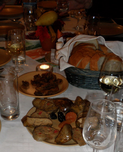 A vacsora libatepertővel, sült libamájjal, töltött libanyakkal, foszlós fehér kenyérrel és lilahagymával indult. Hozzá pedig jófajta borok. Magam is nagy libamáj sütő vagyok, így aztán különösen értékelni tudom a jól elkészített finom, hideg libamájat. Edit (Lojzi felesége) nagyon jól készítette el.