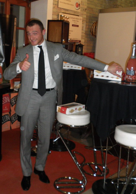A kiállításon a bellini nevű kellemes gyümölcsös koktélokat is kóstolhattam, s a kedvemért egy palack Pinot noir rosé habzóbort is behűtöttek. A bellini koktélok névadója egyébként Giovanni Bellini reneszánsz festő, akinek leginkább annyi köze akad ezekhez a koktélokhoz, hogy a bellini nevet éppen a festő jellemző rózsaszínjei ihlették. Fabio, a cég kereskedelmi igazgatója lelkesedéssel és kétségtelen hozzáértéssel beszélt a cég termékeiről (bellini, rossini koktélok, habzóborok).