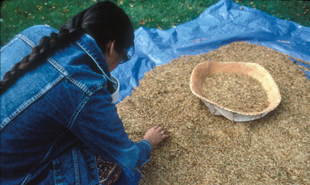 Az Ojibwe közösségek őseik hagyományait követve Minnesota, Wisconsin, Michigan államokban és Kanadában gyűjtik és dolgozzák fel a vadrizst. A manoomin (ojibwa nyelven: „a jó mag”) nem tévesztendő össze a kereskedelmileg termesztett és nemesített „vadrizzsel”.