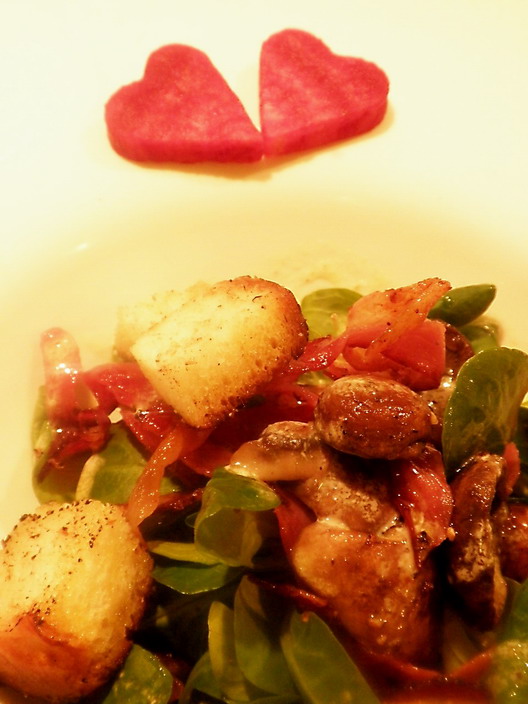 Ha a saláta összetevői már a tányérban vannak, egy kiskanál segítségével a salátára csorgatjuk az öntetet. A tányér szélén elhelyezzük a piros céklaszíveket, s már kész is a Valentin napi saláta.
