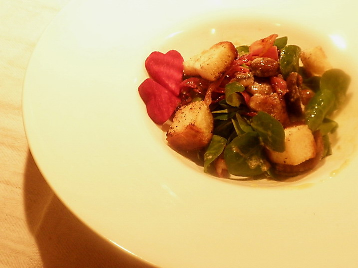 A saláta összeállítása: a madársalátára helyezzük a meleg, enyhén borsos sült gombát, a sós, ropogós fekete erdei sonkát, és a felhasználás előtt szarvasgombás olíva olajjal meghintett illatos, ropogós, édeskés pirított fonott kalács kockákat. (A kalácskockáka olíva olajjal is meghinthetjük, de ez a lépés el is maradhat.)