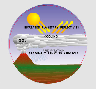 A légkörbe jutó vulkáni por-, s gázfelhők visszaverik a napsugarakat, amitől regionálisan, vagy globálisan csökkenhet az átlaghőmérséklet. A szintén emlegetett Pinotubo 1991 júniusi kitörése például globális hatású volt. Számítások szerint a kitöréssel mintegy 22 millió tonna kén-dioxid (SO2) került a légkörbe. A lehűlés egyes régiókban elérte a 0,5°C-t is. A Pinotubohoz hasonló méretű kitörések szerencsére alig néhány évig befolyásolják a hőmérsékletet.