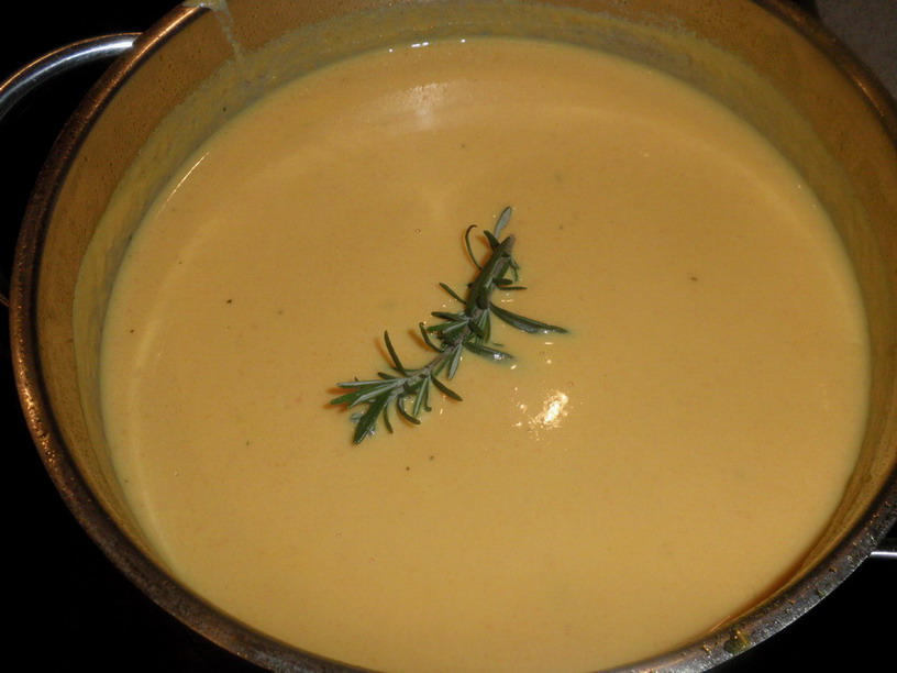 Elkészítése: Lábosba olíva olaj, vaj, sárgarépa, hagyma, burgonya, ízlés szerint kurkuma, chili. Párolás fedő alatt 15 percig. 100 ml víz hozzáadva. Főzés, amíg a burgonya puha nem lesz. Tűzről levesszük, hűlni hagyjuk. ha már 70°C, botmixerrel pépesítjük. Hozzáadjuk az 500 ml tejszínt. Jól elkeverjük, Frissen őrölt borsot, rozmaring ágat, babérlevelet adunk hozzá. Megsózzuk és a hőmérsékletet 80°C-ra emeljük, majd a levest levesszük a tűzről és hagyjuk hűlni. A fűszerezést ellenőrizzük és ízlés szerint még sózunk.