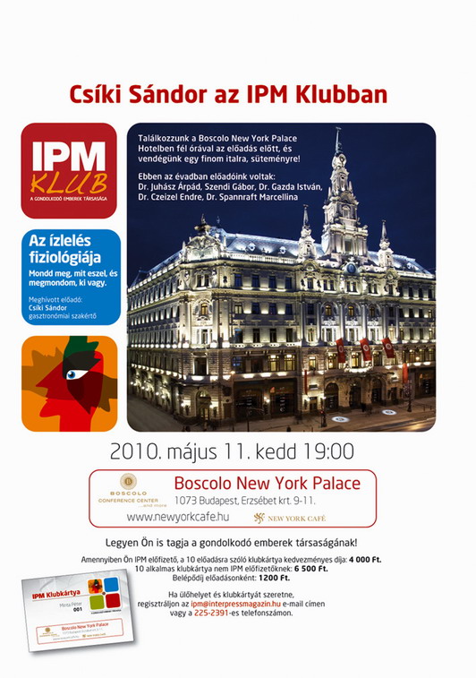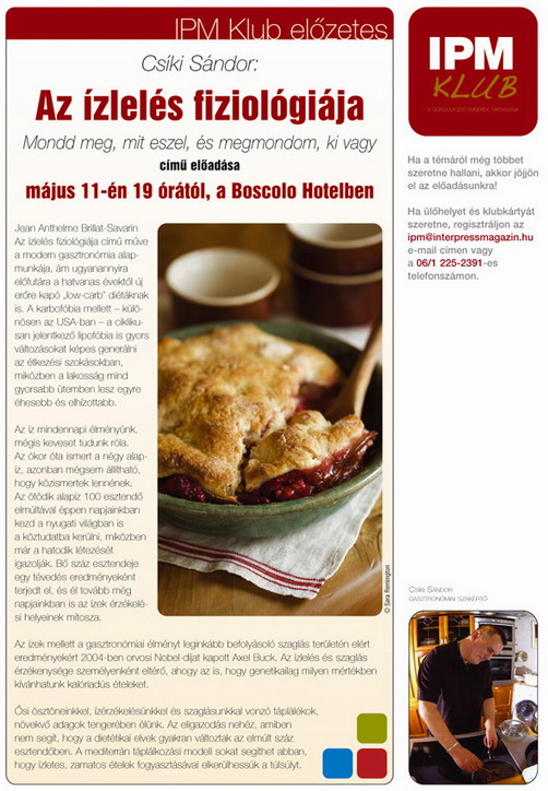 AZ IPM KLUB szervezésében május 11-én 19 órától előadást tartok a Boscolo Hotelban. Az IPM Klubnak ebben az évadban olyan neves előadói voltak, mint Dr. Juhász Árpád, Szendi Gábor, dr. Gazda István, dr. Czeizel Endre, Dr. Spannraft Marcellina. Előadásomban az ízlelésről, a táplálkozásról, az elhízásról beszélek az értő és érdeklődő közönségnek. Részletek az alábbiakban.