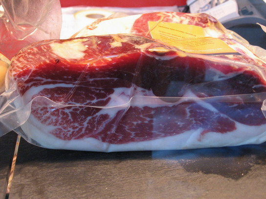 A legdrágább serranoi módra elkészített sonkák így festenek keresztmetszeti, illetve metszeti oldalról. Érdemes megfigyelni a nagyon egyenletes zsírrétegeket. A minőséghez persze mélyen a pénztárcába kell nyúlni. A következő csoda 148 euró kilógrammonként.