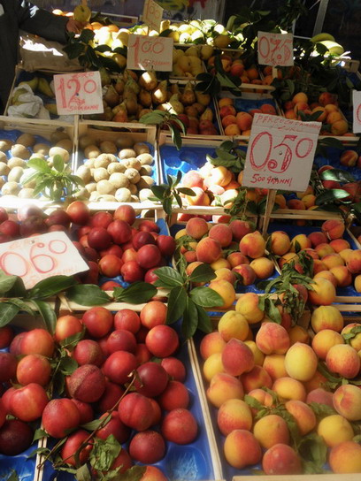 Az őszibarack választék is nagy már ilyenkor, köztük mézédes görögdinnyére emlékeztető zamatú gyümölccsel is. Az árak a 0,5 és 3 EUR/kg között szórnak.