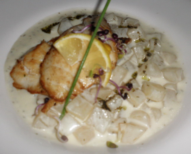 Második fogásként a „Magyaros ételek” között szereplő „Joghurtos karalábéfőzelék enyhén füstölt vajhal filével” elnevezésű ételt választottam. A remek leves után némiképpen csalódást jelentett, hogy a Balaton parti étterem séfje a „magyaros” ételhez (mélyfagyasztott) vajhalat társít.