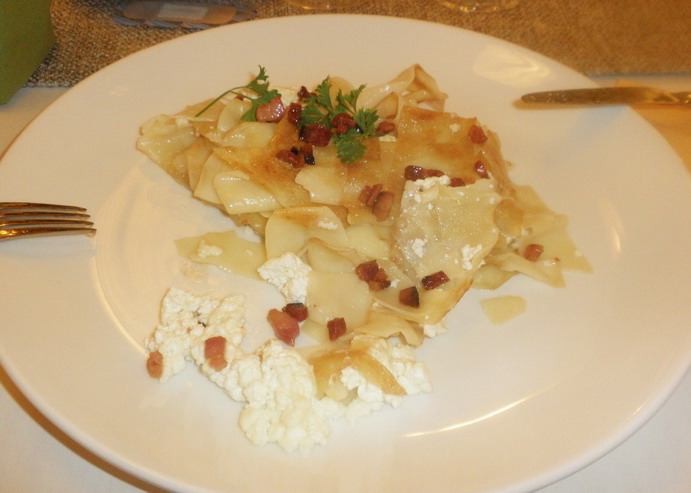 A halászlé után (éhesek nem voltunk), Tamás túrós csuszát ajánlott. Csusza? Legyen, gondoltam, ám sokat nem vártam tőle, mivel túl rosszak a tapasztalataim a honi csuszakészítésről. Jól tettem, tettük, hogy elfogadtuk a javaslatot, mert ami csusza címen következett az mindhármunk véleménye szerint kimagasló volt.