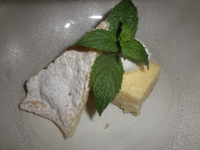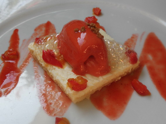 A napi ajánlatban szereplő desszert eperfagylaltos, paprikás, túrókrémes kompozíció volt. Kellemes volt, nyárias, könnyű, a paprikával cseppet meghökkentő, vagyis illett az étteremhez. Én ugyan szívesebben ettem volna paprikafagylaltos, epres változatban, némi (igény szerinti) csípősséggel, de eredeti formájában is tetszett.