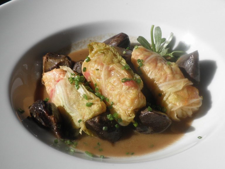A főétel hibátlan volt: „Kacsazúza lecsóval töltött kel-levelekkel”. Fantasztikus textúrájú zúza, innovatív „lecsó”, kelkáposzta levelek. A lecsó persze nem a megszokotthoz közelítő házi lecsó, s gersli is keveredett hozzá bőven, tehát aki lecsót akar enni, az ne ezt válassza. Ez az étel leginkább a fentebb már dicsért textúrák játékosságával ragadott meg. Ez a Kistücsök magasztalt bája. Emlékezetes étel, megérdemli a jó szót, mindenkinek ajánlom. Az ebédhez Légli rozét ittam, annak a borásznak a borát, aki talán éppen az idei évnek (2010) lesz az Év Borásza. Esélyes rá.